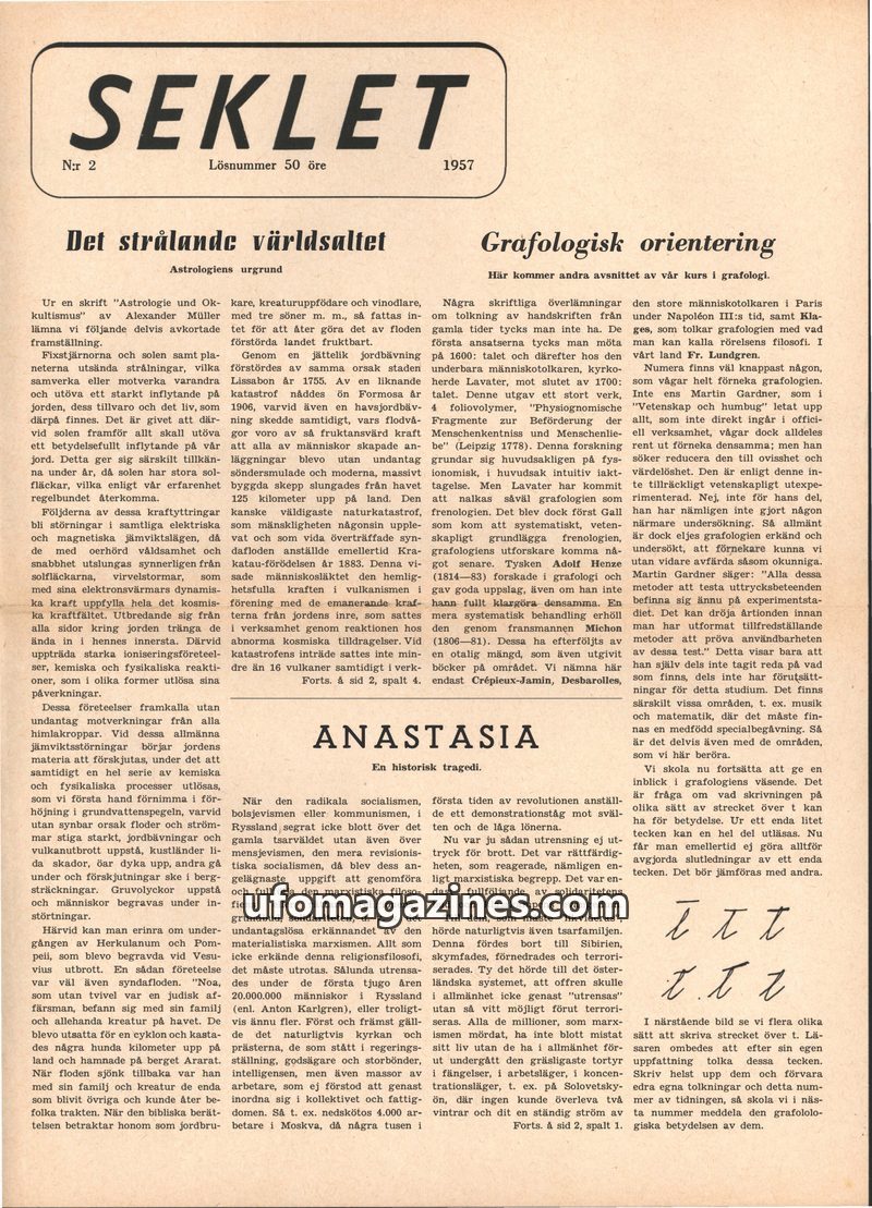 This issue of Seklet magazine from 1957 delves into various intriguing topics. It discusses cosmic influences on Earth, the principles of graphology, and the historical tragedy of