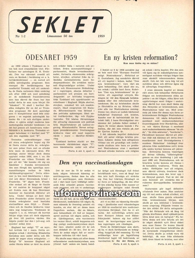 This issue of Seklet delves into astrological predictions for 1959, labeling it an 'Ödesåret' (Fateful Year) with potential global crises. It examines the concept of a 'New Christi