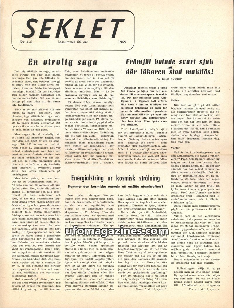 This issue of SEKLET from 1959 covers a wide range of topics, including the surprising healing properties of pollen, particularly for prostate issues and general health. It delves