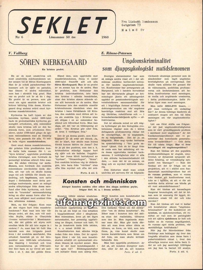 This issue of SEKLET from 1960 delves into various topics including Sören Kierkegaard's philosophy of Christian individualism, the societal phenomenon of youth crime analyzed throu