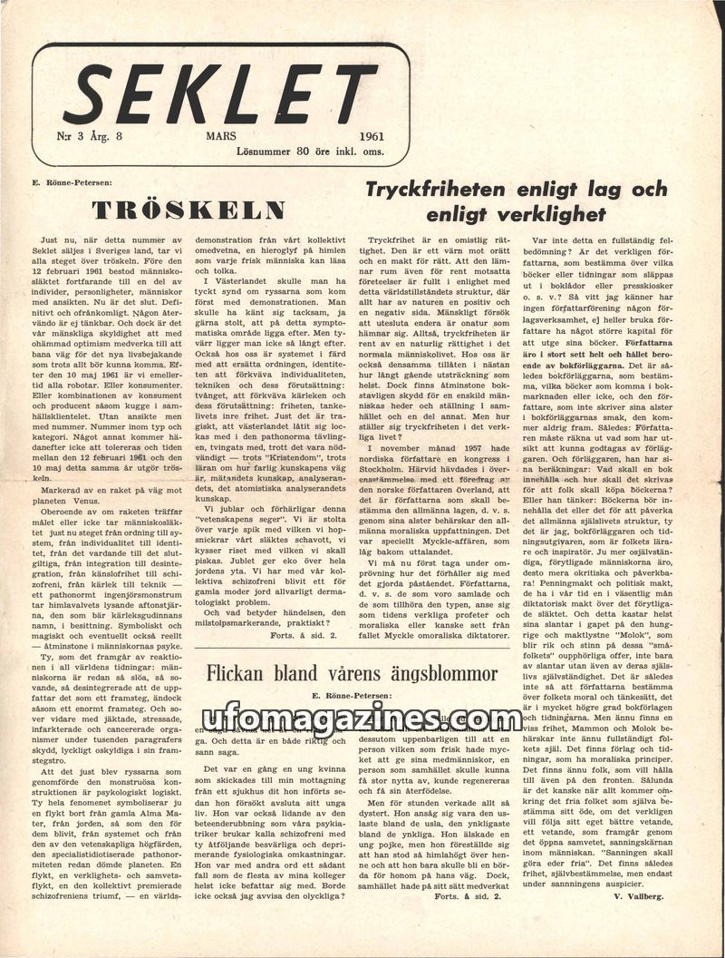 This issue of SEKLET magazine from March 1961 delves into various societal and psychological themes. E. Rönne-Petersen discusses the concept of 'the threshold' of human existence,