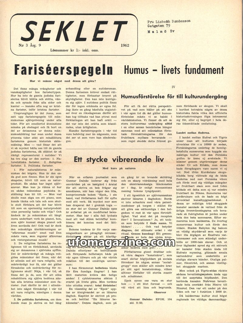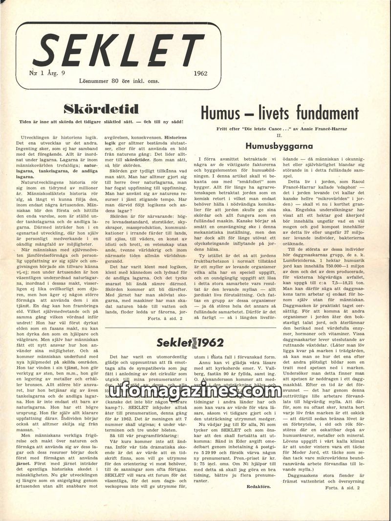 This issue of SEKLET from 1962 delves into various topics, including the nature of 'Pharisees' in modern society, the critical role of humus in preventing the collapse of civilizat