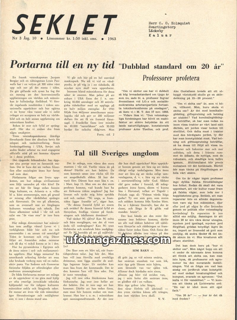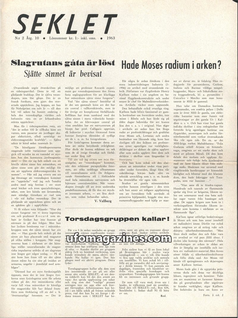 This issue of SEKLET magazine from 1963 delves into parapsychology, ancient technology, and spiritualism. It features an article on Rocards' experiments suggesting the sixth sense