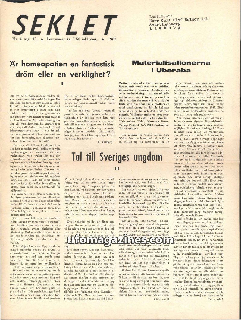 This issue of SEKLET magazine from 1963 delves into various topics including the efficacy of homeopathy, sensational materialization experiments in Uberaba, Brazil, and the importa