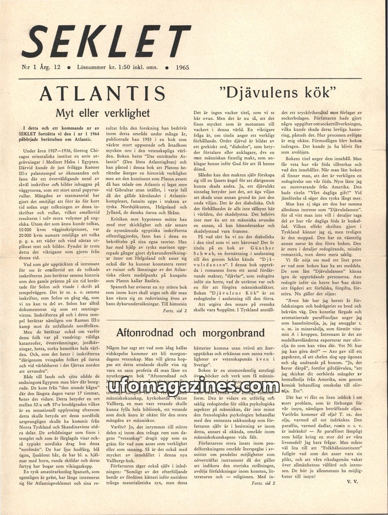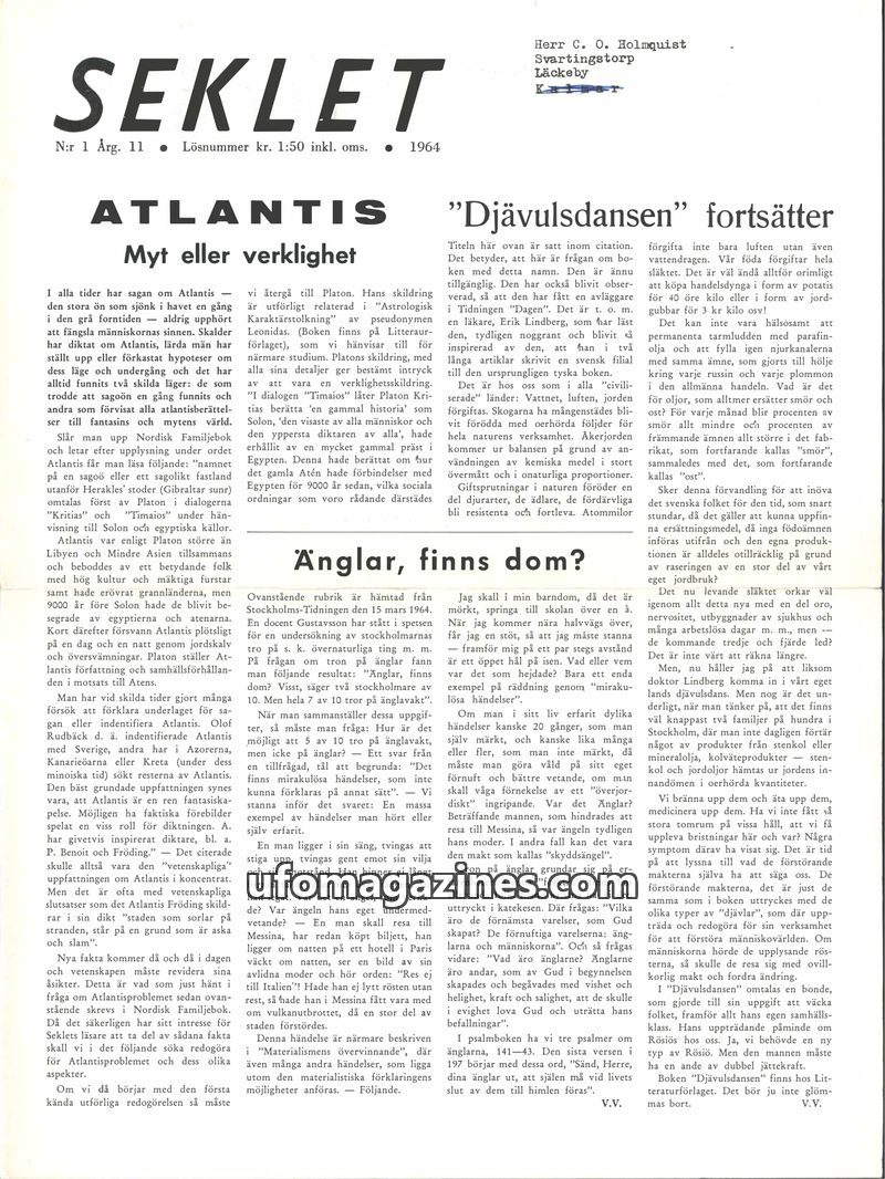This issue of SEKLET magazine from 1964 delves into the enduring myth of Atlantis, presenting Plato's account and discussing various theories about its existence and location. It a
