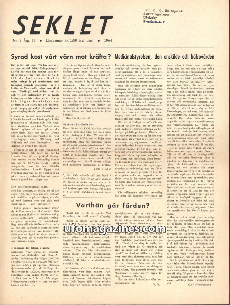 This issue of SEKLET from 1964 discusses Dr. Johannes Kuhl's theories on cancer prevention through a diet rich in fermented foods, emphasizing its role in strengthening the body. I