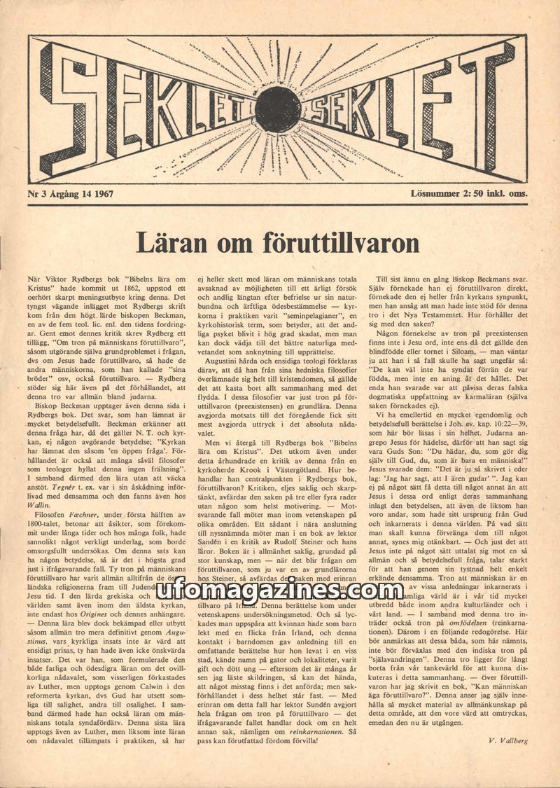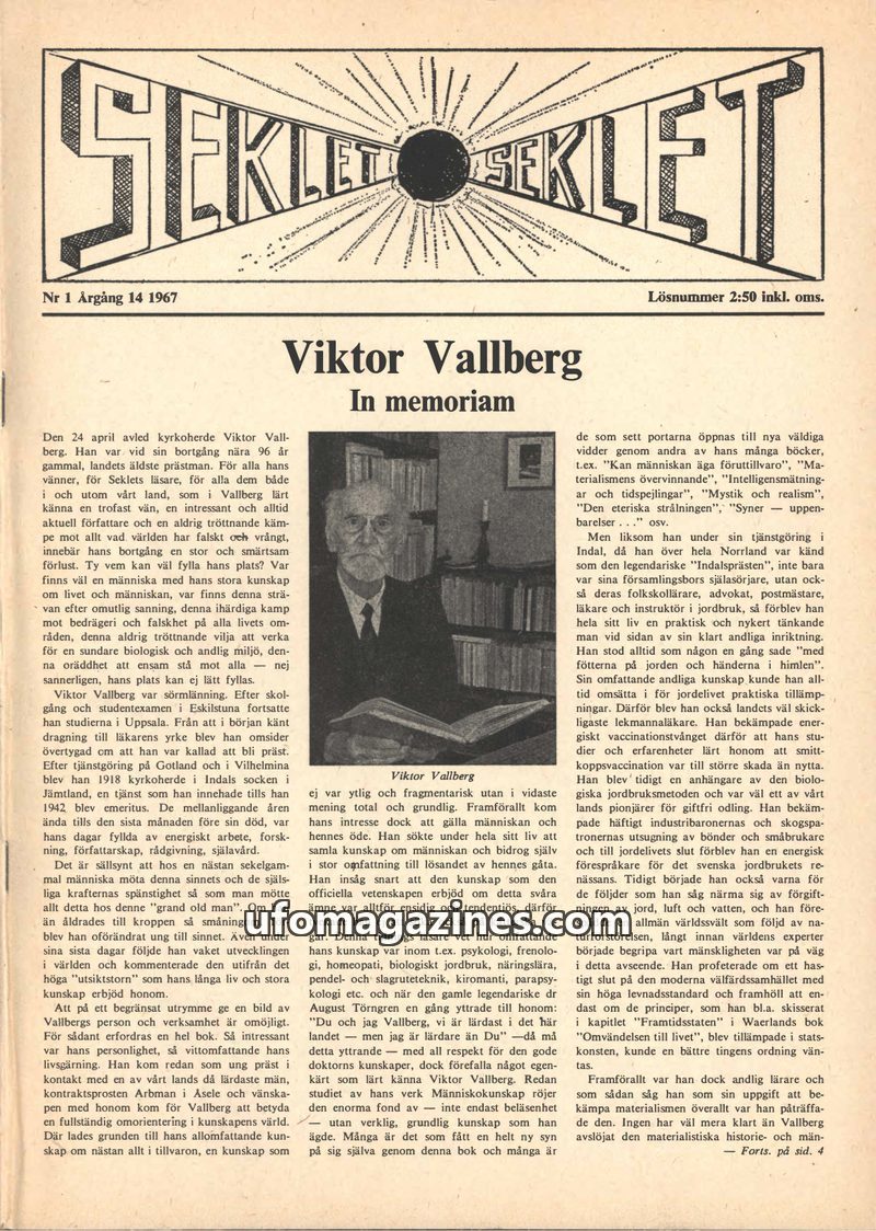 This issue of SEKLET is dedicated to the memory of Viktor Vallberg, a Swedish clergyman and prolific author who passed away at the age of 96. The magazine highlights his extensive