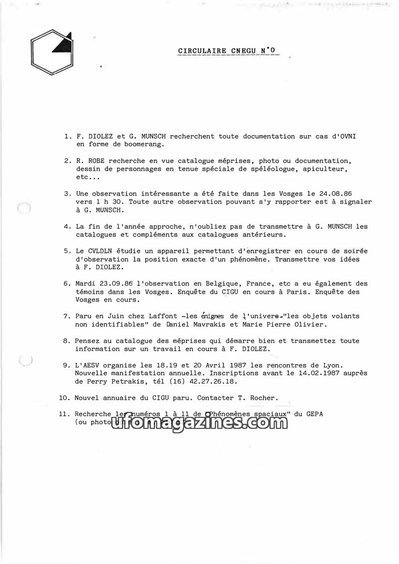This circular from CNEGU outlines ongoing UFO research, including a search for boomerang-shaped UFO documentation by F. DIOLEZ and G. MUNSCH. R. ROBE is cataloging misidentificatio