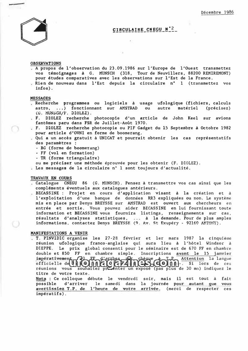 This December 1986 issue of CIRCULAIRE CNEGU N°2 focuses on ufological research and observations. It includes requests for software, photocopies of articles, and information on spe