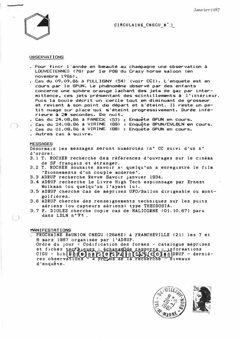This issue of CIRCULAIRE CNEGU from January 1987 details recent UFO observations, including a phenomenon in Fulligny involving an orange sphere with gas jets. It also lists researc