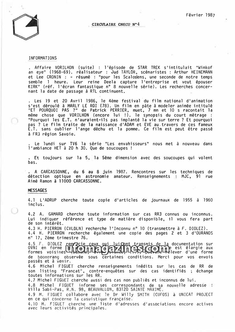 This issue of CIRCULAIRE CNEGU N 4 from February 1987 covers various topics including updates on the VORILHON UFO case, a review of an animated film with UFO themes, and announceme