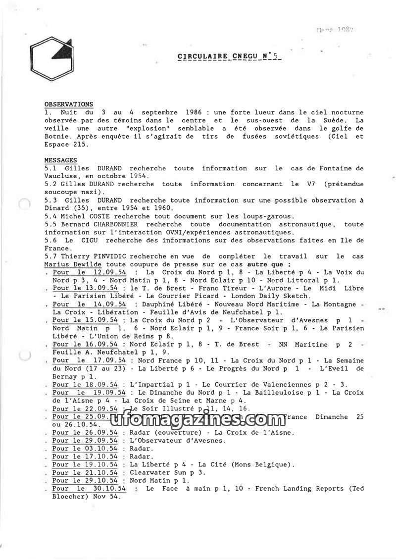 This issue of Circulaire CNEGU N5 reports on a 1986 UFO sighting in Sweden attributed to Soviet rocket launches. It includes numerous requests for information on historical cases f