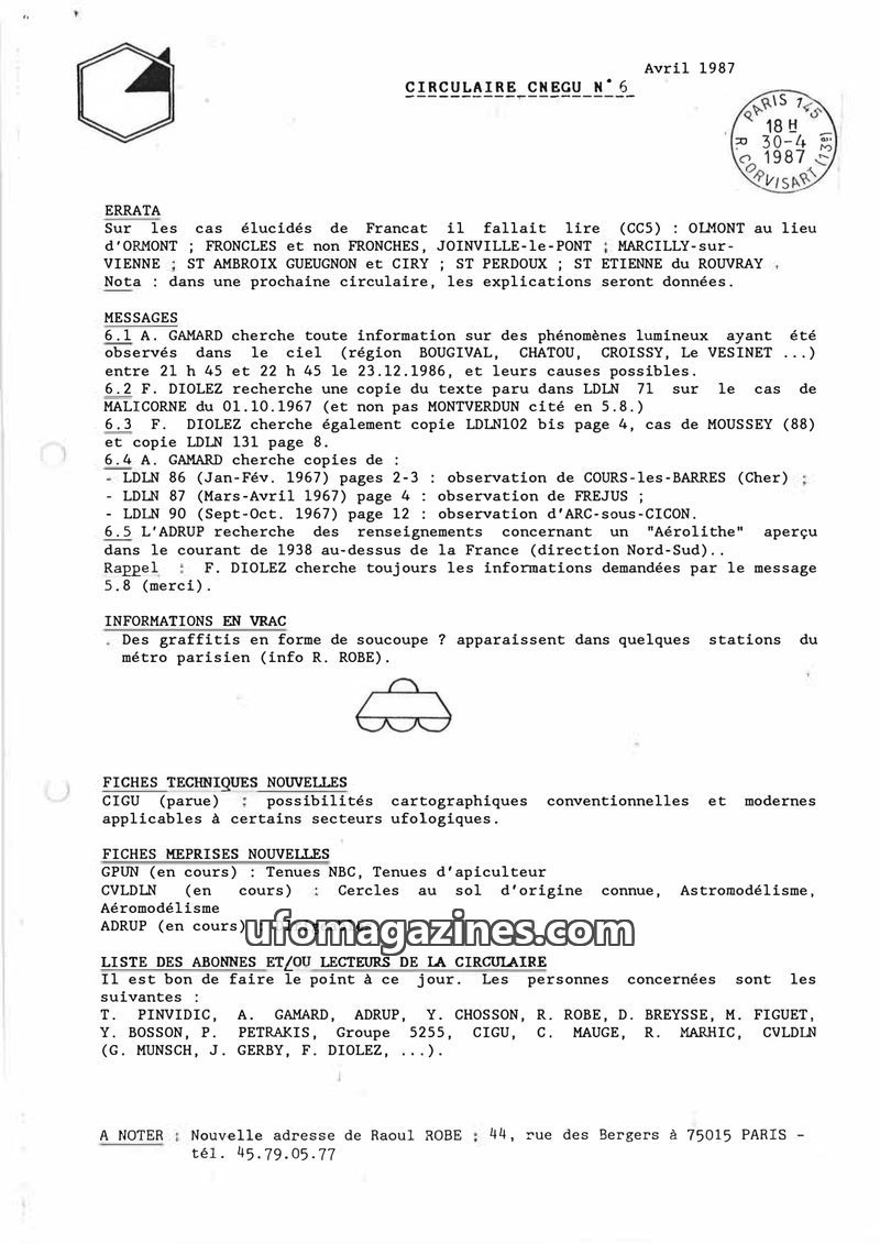 This April 1987 issue of Circulaire CNEGU focuses on UFO sightings and ufological research. It includes an errata for previous cases, requests for information on luminous phenomena