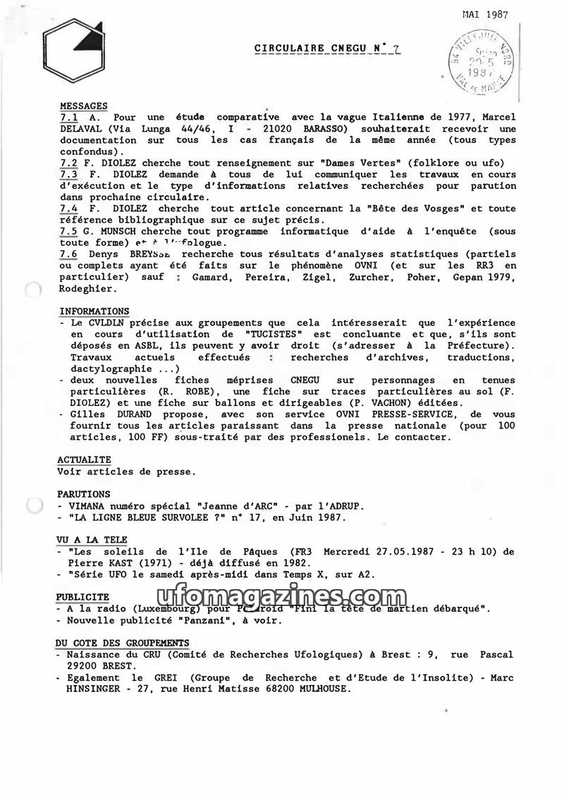 The May 1987 CNEGU Circular (Issue 7) details ongoing UFO research requests, including comparative studies of Italian waves and specific phenomena like 'Dames Vertes' and the 'Bête