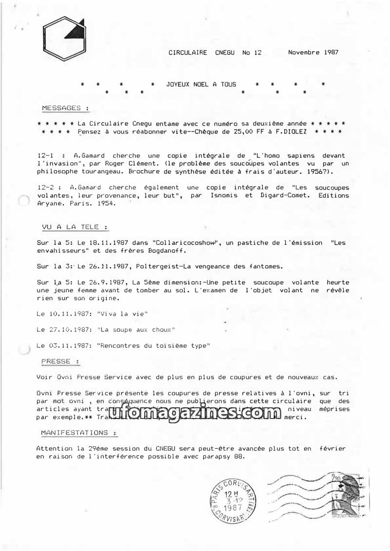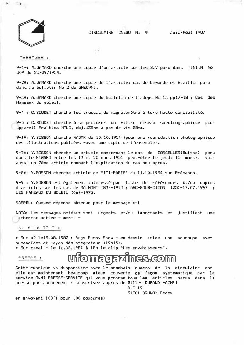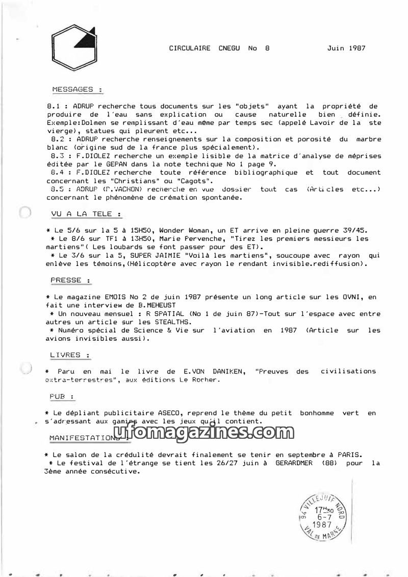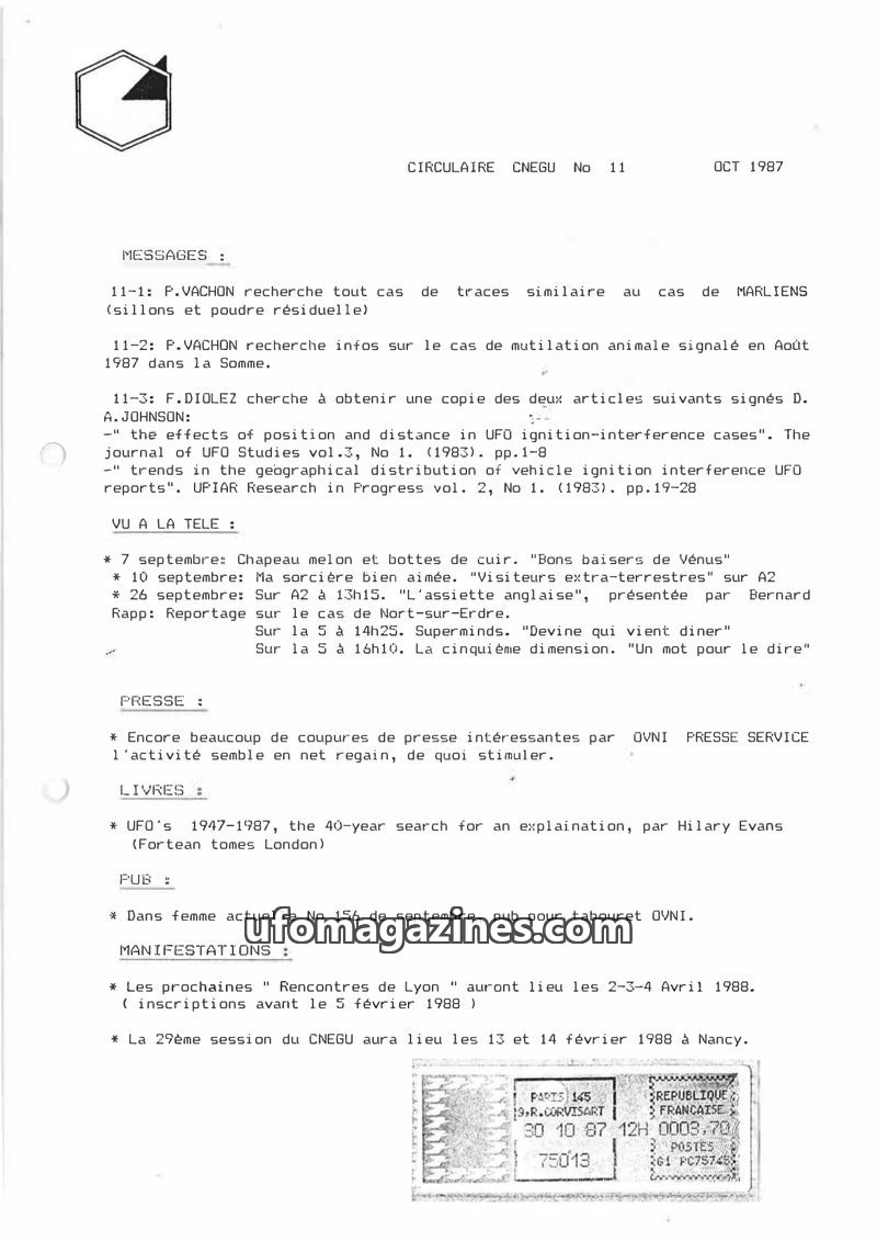 This issue of Circulaire Cnegu from November 1987 covers various UFO and paranormal topics. It includes requests for specific books on UFOs, mentions of UFO-related segments on tel
