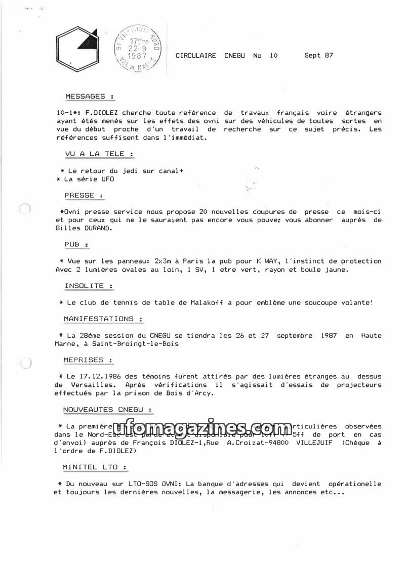 This issue of the CNEGU Circular from October 1987 reports on ongoing UFO investigations, including requests for information on specific cases like Marliens traces and animal mutil