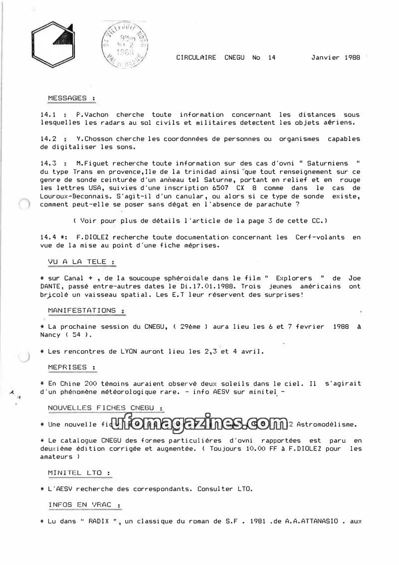 This issue of CIRCULAIRE CNEGU from March 1988 focuses on ongoing UFO research and media coverage. Several researchers, including Y. Bosson and F. Diolez, are actively seeking spec