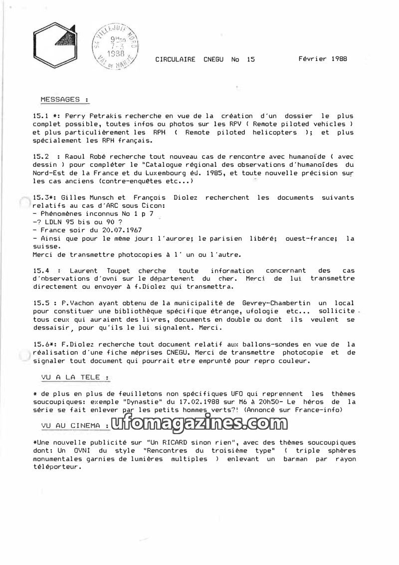 This issue of the CNEGU Circular (No. 15, February 1988) focuses on UFO and humanoid research requests and recent sightings. Researchers are seeking information on Remote Piloted V