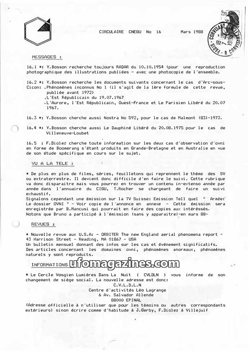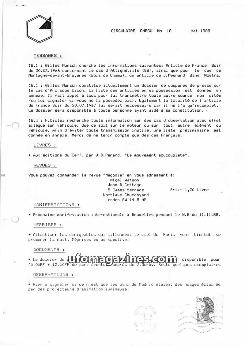 This issue of CIRCULAIRE CNEGU from May 1988 focuses on research and documentation of UFO cases. It includes requests for specific articles concerning cases in Attignéville, Mortag