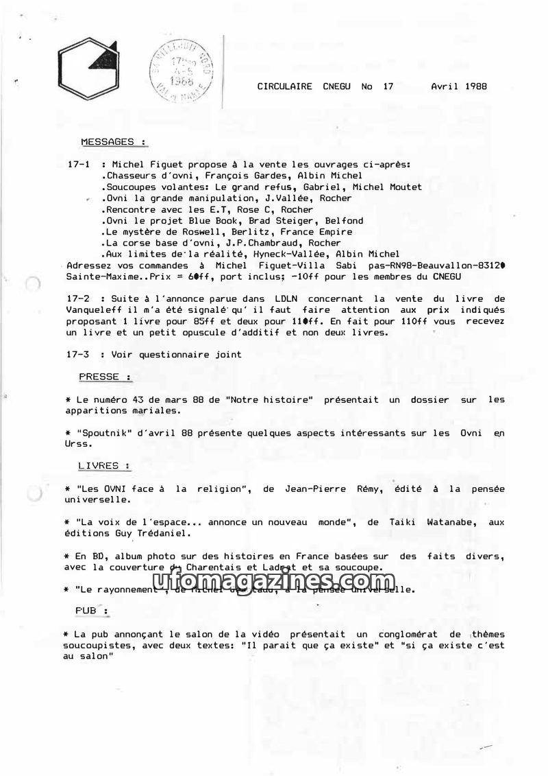This issue of the CNEGU Circular (No. 17, April 1988) focuses on recent UFO observations and related publications. It lists books for sale by Michel Figuet, including titles on UFO
