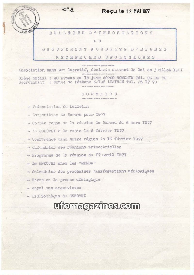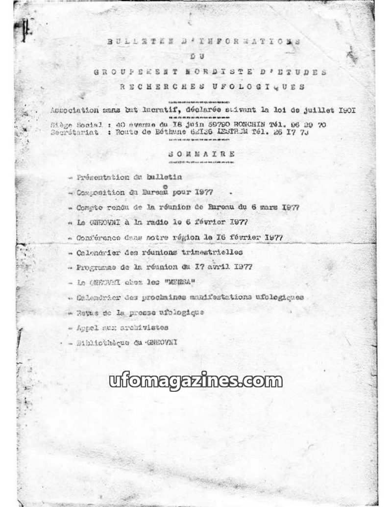 This bulletin from the Groupement Nordiste d'Etudes Recherches Ufologiques (GNEOVNI) for 1977 details the organization's activities. It includes the composition of the 1977 bureau,
