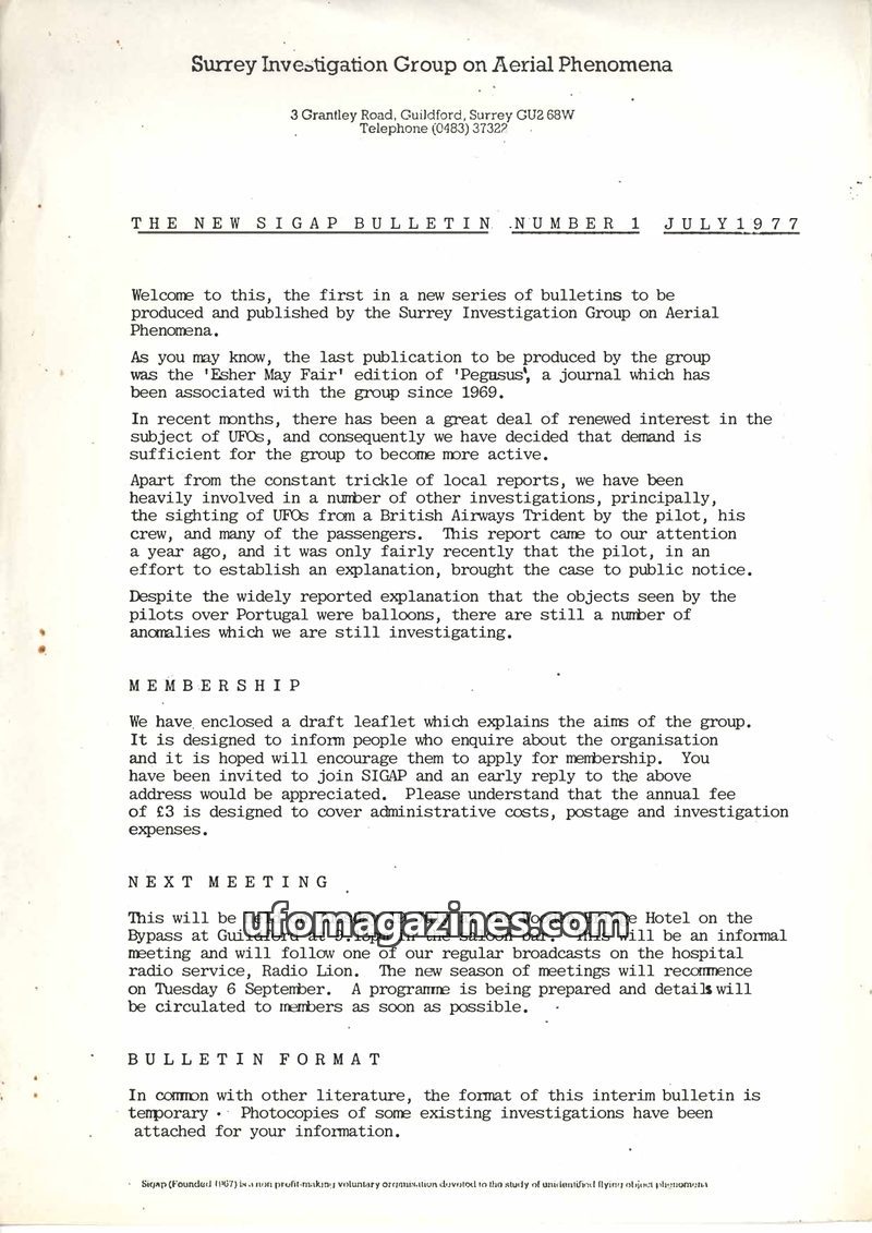 This is the inaugural issue of 'The New SIGAP Bulletin' from the Surrey Investigation Group on Aerial Phenomena, dated July 1977. The group has become more active due to renewed in