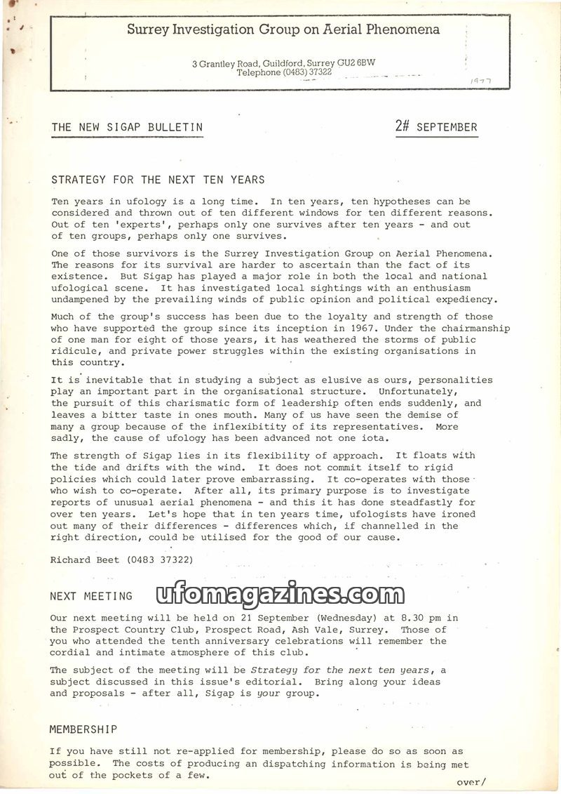 The Surrey Investigation Group on Aerial Phenomena (SIGAP) discusses its strategy for the next ten years, emphasizing flexibility and cooperation. The bulletin reports on recent UF