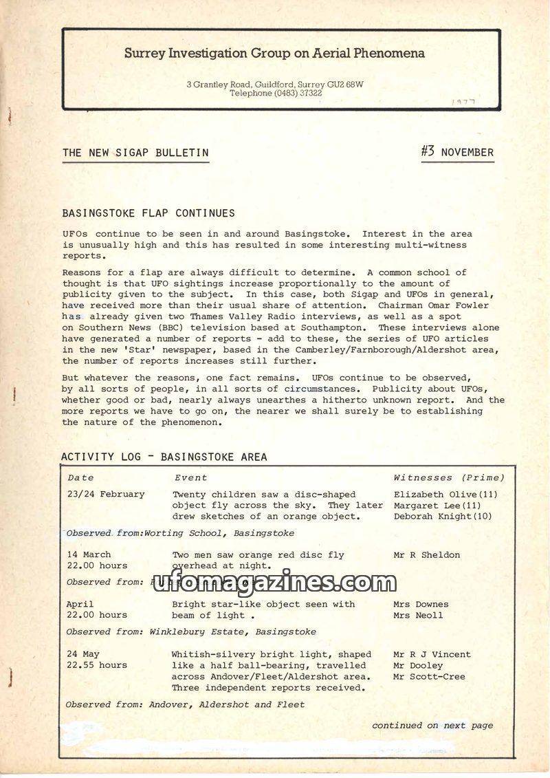 This issue of THE NEW SIGAP BULLETIN focuses on the continuing UFO sightings in the Basingstoke area, noting unusually high public interest. Chairman Omar Fowler has been active in