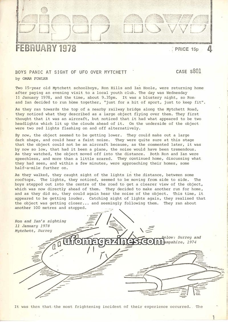 This issue of Bigap News features a report on a UFO sighting by two Mytchett schoolboys, Ron Hills and Ian Hoole, on January 11, 1978. They described a large object with headlights