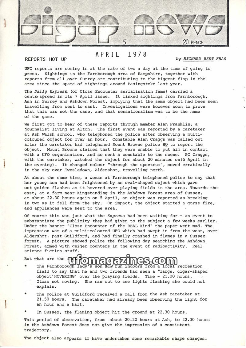 This issue of Sigap News reports on a spate of UFO sightings in the Farnborough area in April 1978, including a multi-coloured object seen over Ash Walsh school, a flashing oval ob