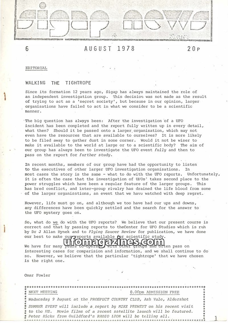 This issue of Sigap News, dated August 1978, focuses on the group's independent approach to UFO investigation and the challenges of sharing findings. It includes a detailed report