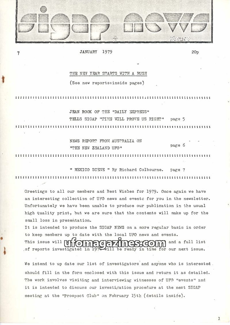 This issue of SIGAP NEWS from January 1979 covers recent UFO reports and investigations. It includes a detailed account of a 1937 sighting by Major F. Turner-Bridger in Surrey, UK,