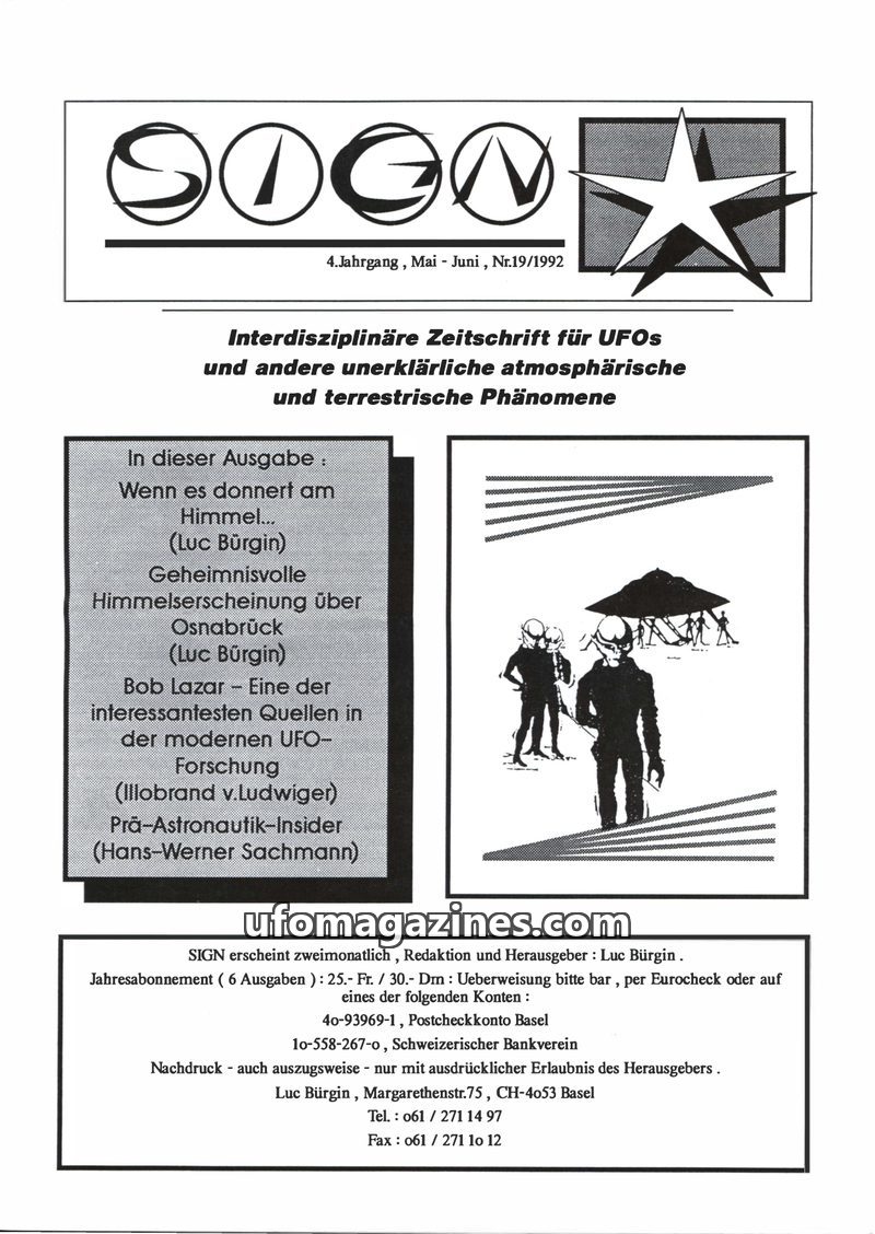 This issue of SIGN magazine delves into various unexplained phenomena. It features an in-depth report on Bob Lazar's claims about reverse-engineering alien technology at Area 51, p