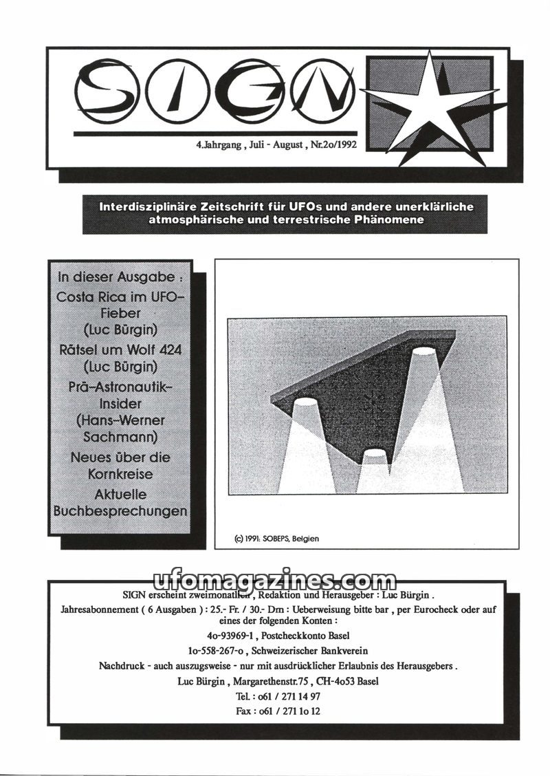 This issue of SIGN magazine delves into various unexplained phenomena. It reports on a wave of UFO sightings and associated electromagnetic effects in Costa Rica during April 1992.