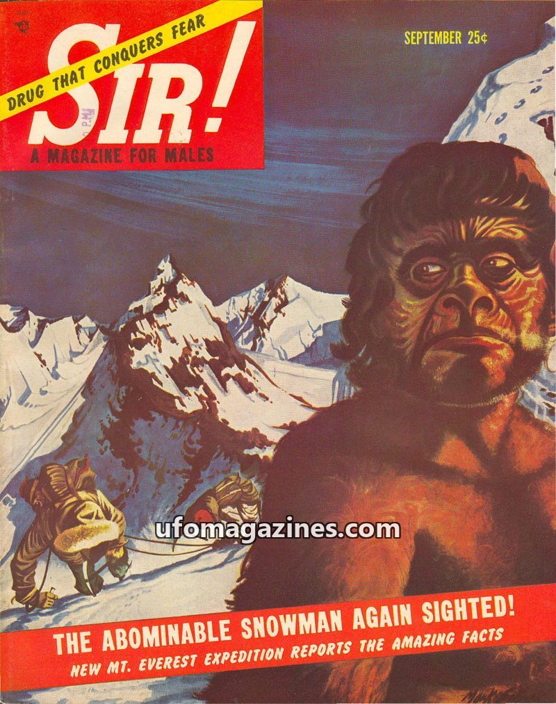 This issue of SIR! Magazine from September 1956 prominently features a report on the Abominable Snowman, citing new Mt. Everest expedition findings. It also delves into speculative