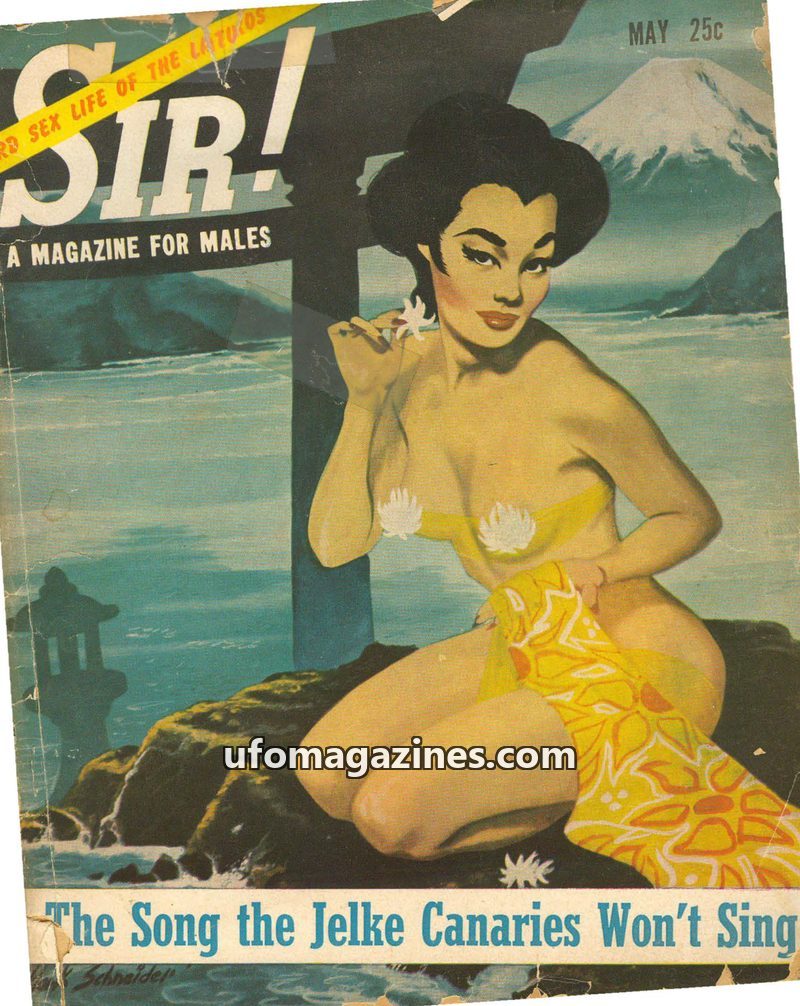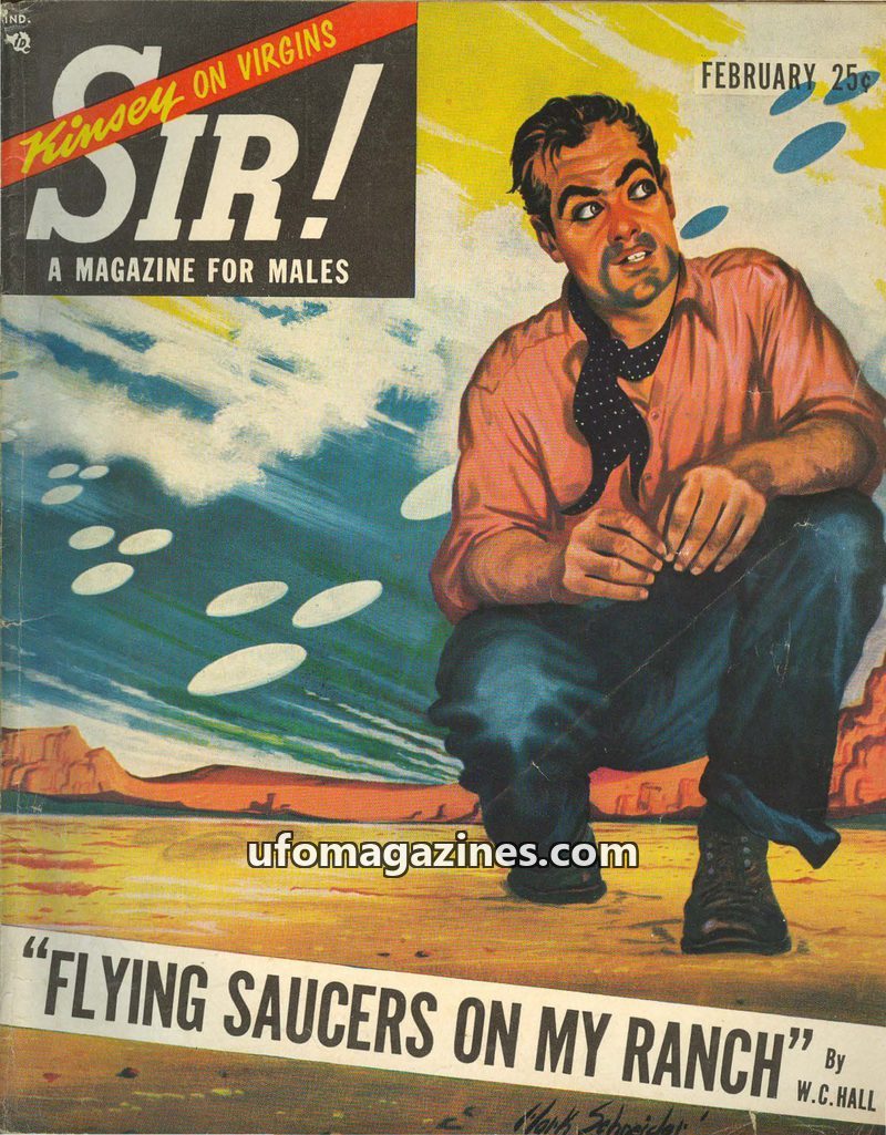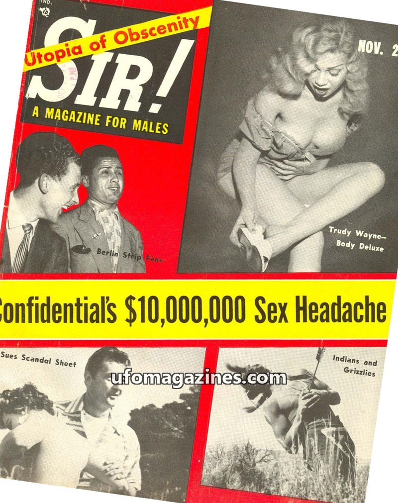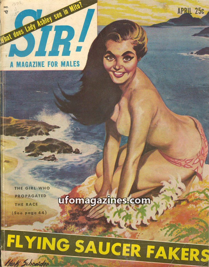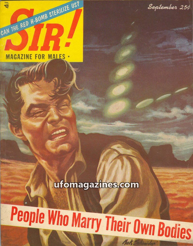 This issue of SIR! Magazine for Males from September 1950 delves into the mystery of a captured flying saucer that crashed on Heligoland, possibly due to H-bomb related atmospheric