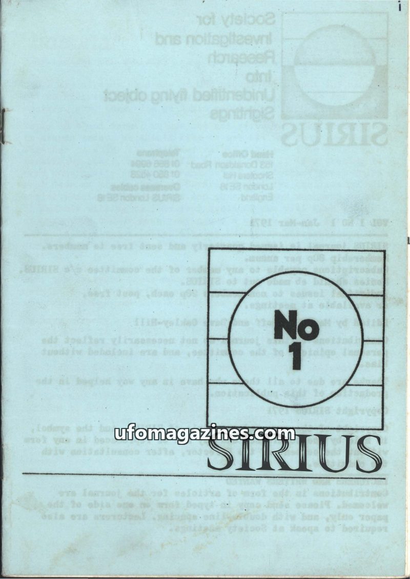 This inaugural issue of SIRIUS magazine (Jan-Mar 1971) focuses on UFO research and sightings. It includes personal accounts of UFOs seen from cars, an investigation into the Tungus