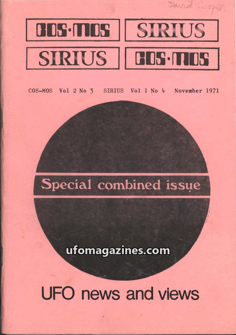 This combined issue of COS-MOS and SIRIUS announces their merger into a new publication called GEMINI, launching in 1972. The editorial focus shifts to private research and dissemi