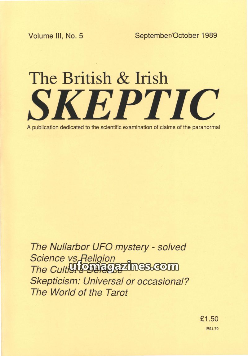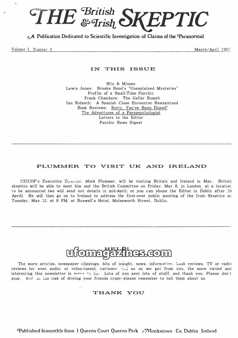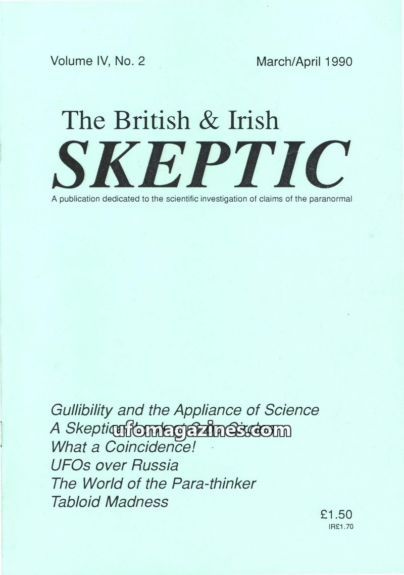 This issue of The British & Irish Skeptic announces Mark Plummer's visit to the UK and Ireland for CSICOP. It features a report on Brooke Bond's 'Unexplained Mysteries' card series