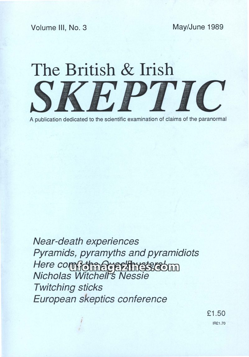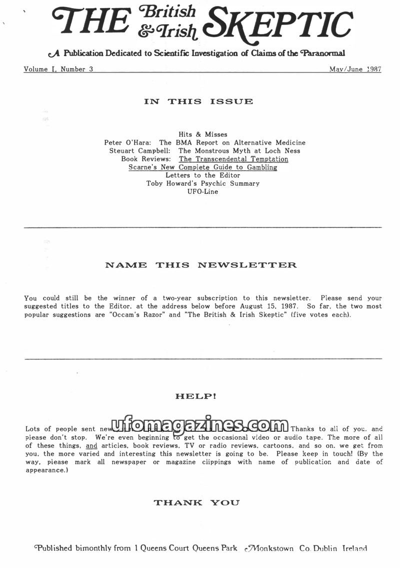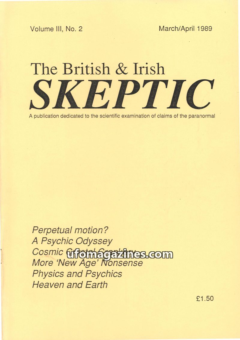 The first issue of The British & Irish Skeptic (Jan/Feb 1987) launches with a call for a new newsletter name and features articles by prominent skeptics. James Randi discusses the