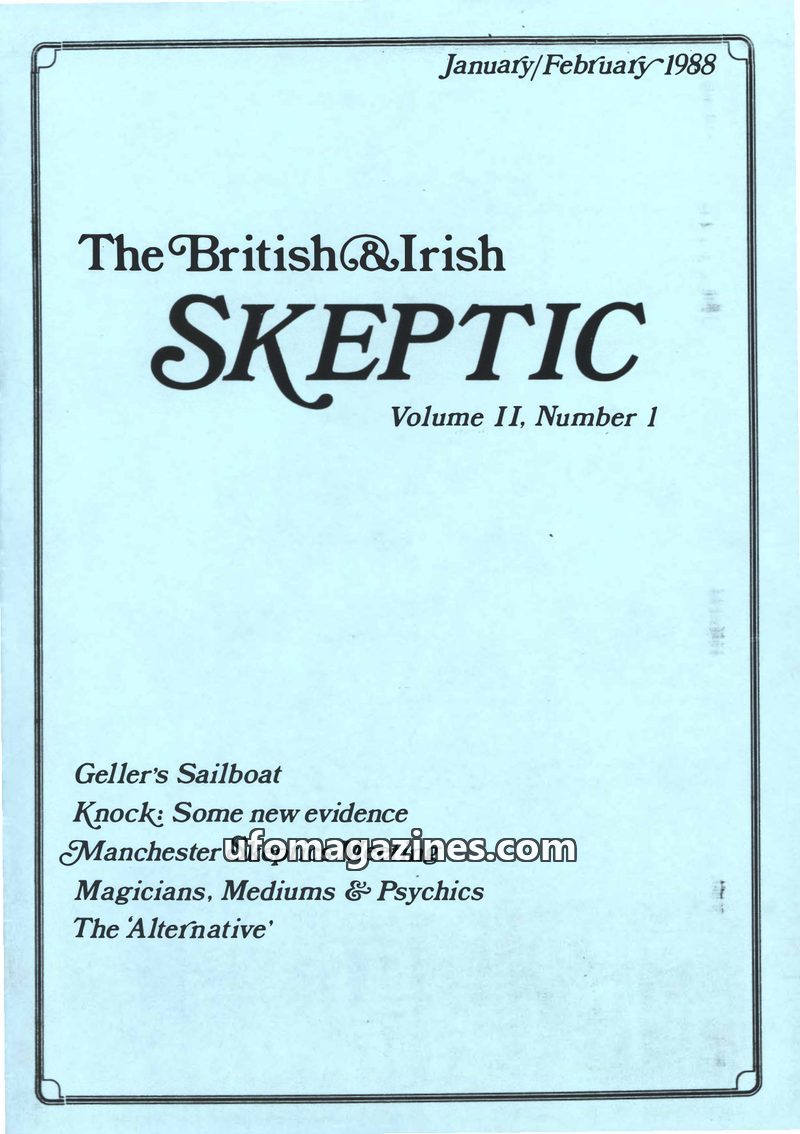 This issue of The British & Irish Skeptic, dated January/February 1988, covers a range of skeptical investigations and reports. It features articles on Uri Geller's alleged abiliti