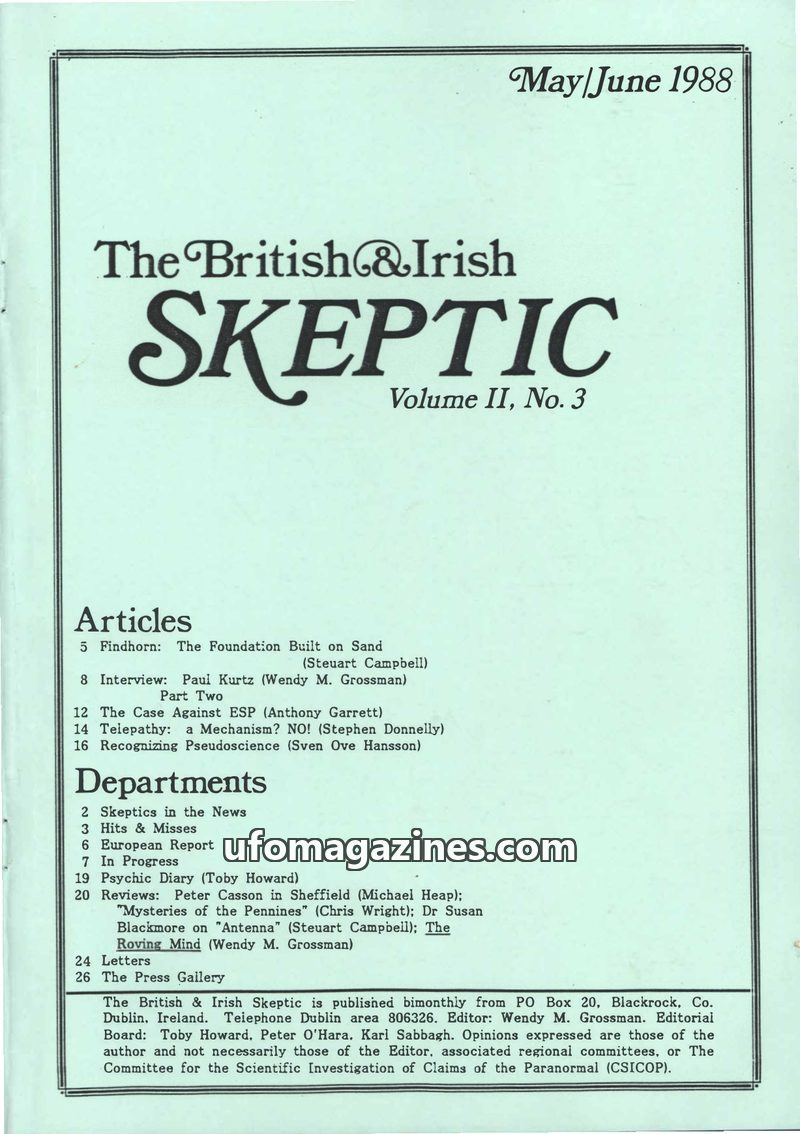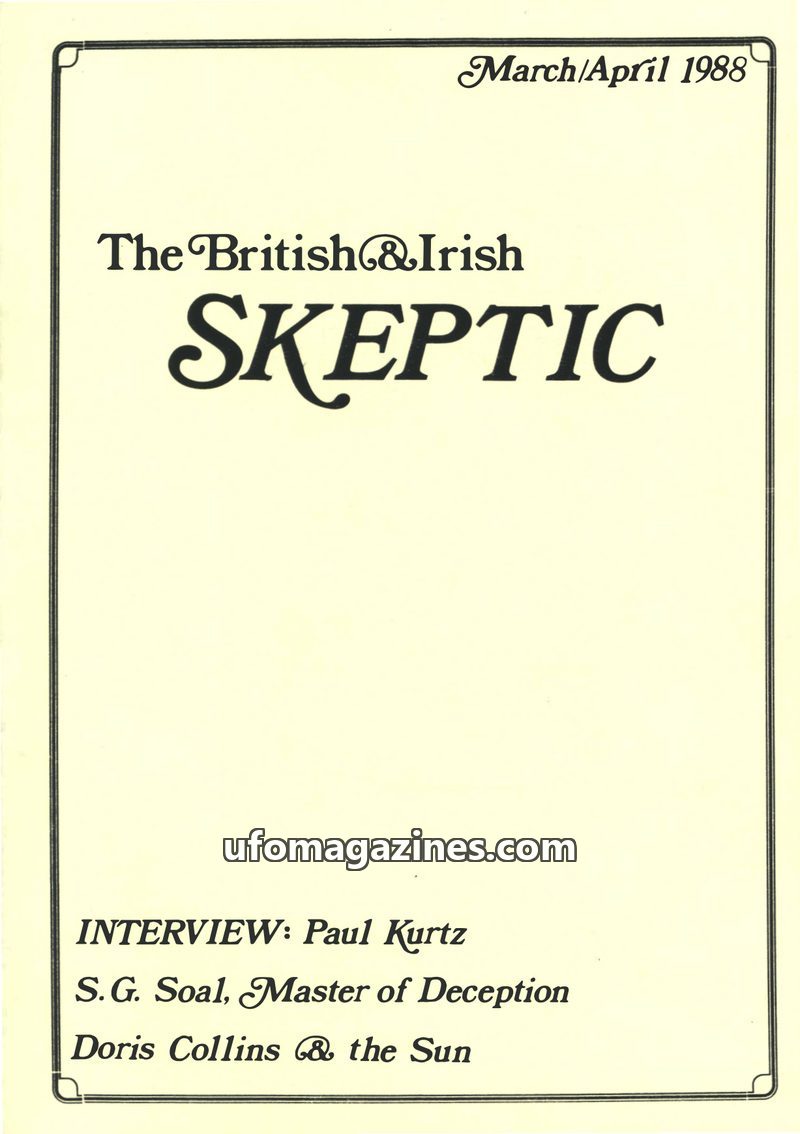 This issue of The British & Irish Skeptic, dated March/April 1988, includes an interview with Paul Kurtz, chairman of CSICOP. It features articles on S.G. Soal, 'Master of Deceptio