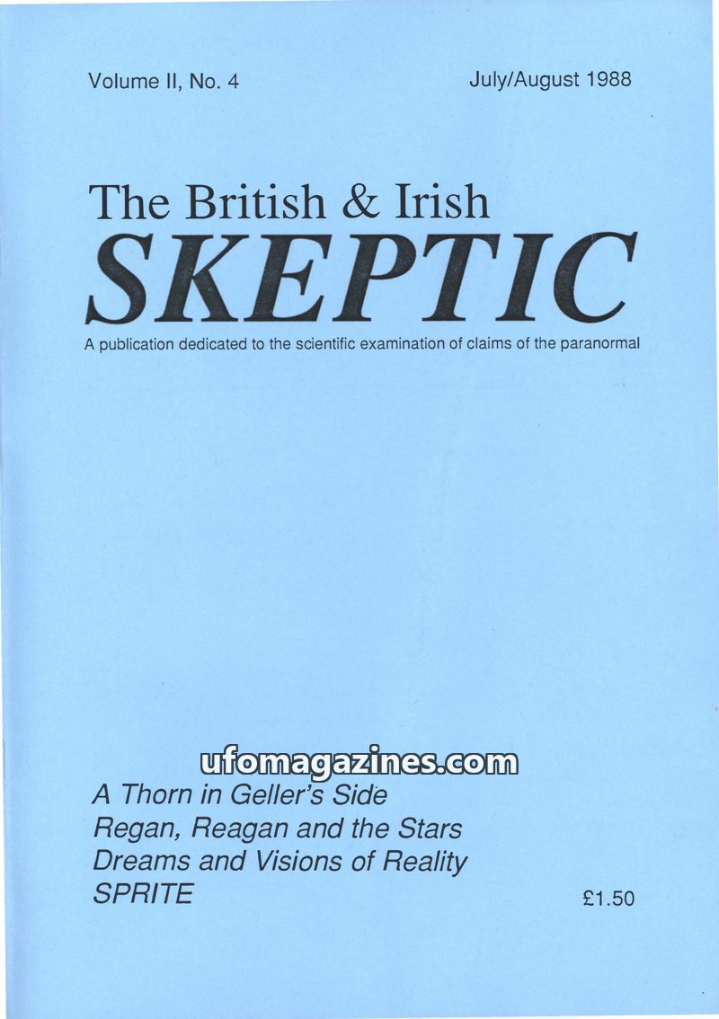This issue of The British & Irish Skeptic, dated July/August 1988, features an in-depth report on an exhibition where Uri Geller was challenged on his spoon-bending abilities, with