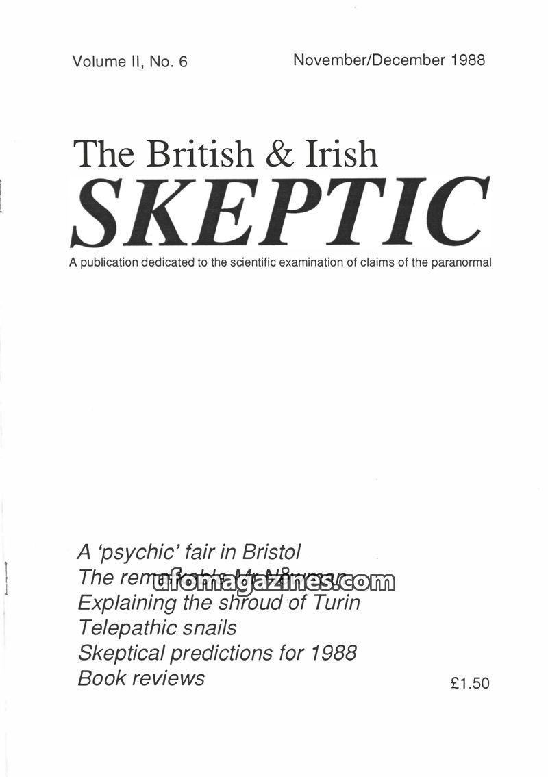 This issue of The British & Irish Skeptic, dated November/December 1988, covers a range of topics related to skepticism and the paranormal. It reports on the formation of new skept