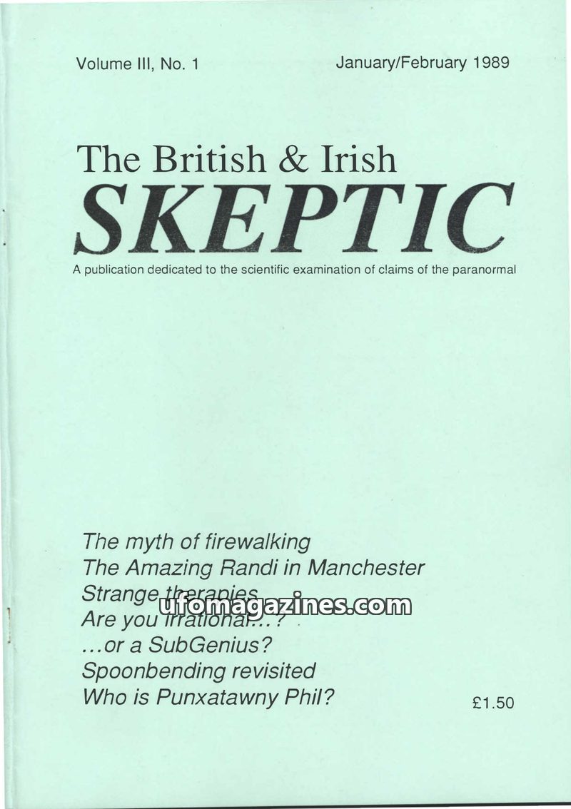 The January/February 1989 issue of The British & Irish Skeptic delves into various pseudoscientific claims and skeptical investigations. Articles cover the myth of firewalking, exp