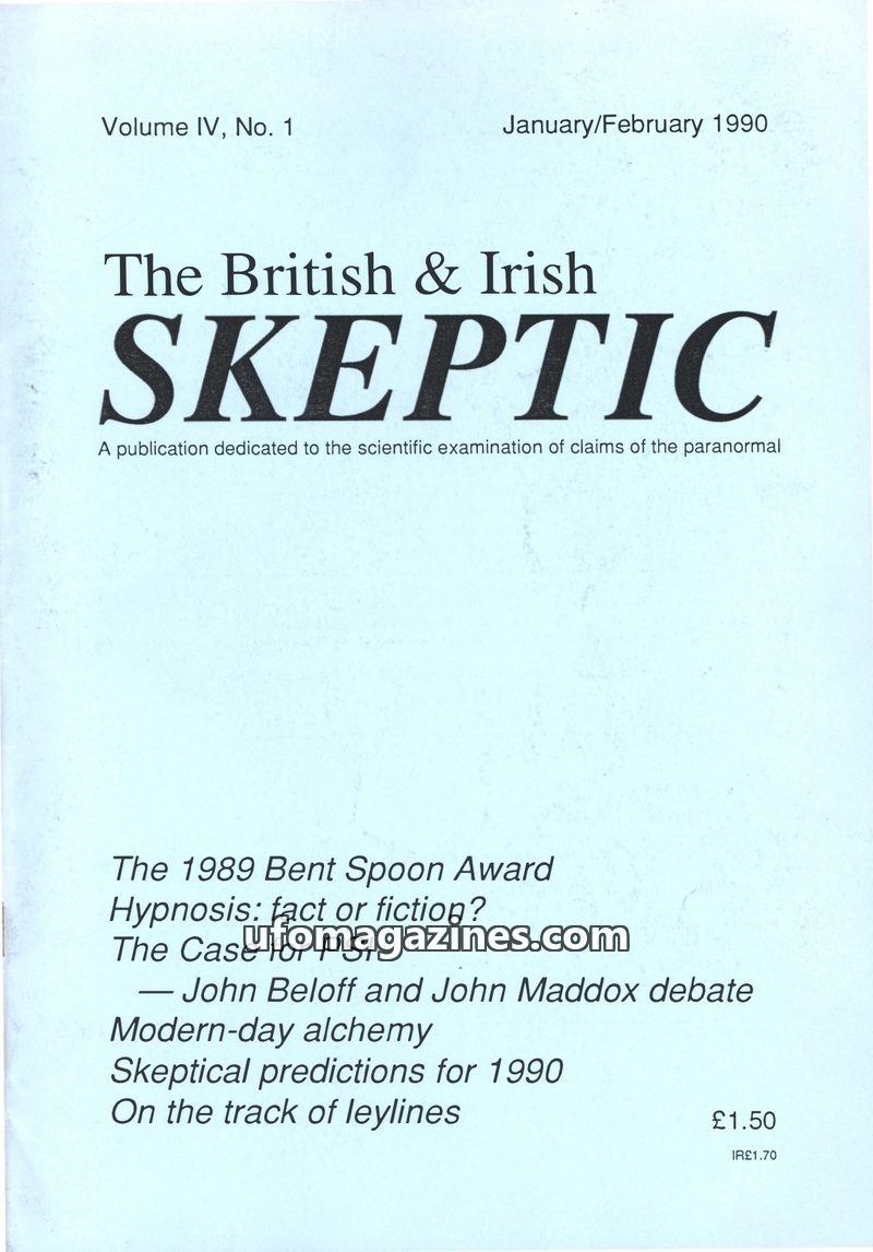 This issue of The British & Irish Skeptic, dated January/February 1990, explores various paranormal claims and skeptical viewpoints. Articles cover the 1989 Bent Spoon Award, a deb