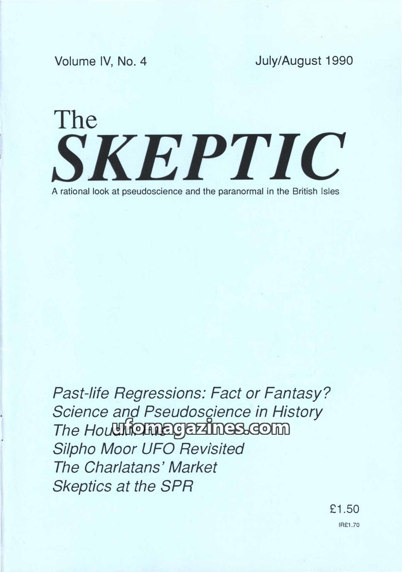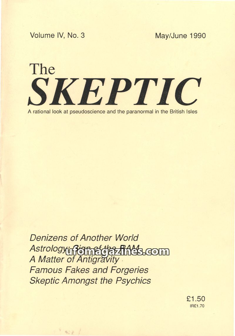This issue of The Skeptic (July/August 1990, Vol. IV, No. 4) examines various paranormal claims with a rational perspective. Articles cover UFO sightings, including the debunking o