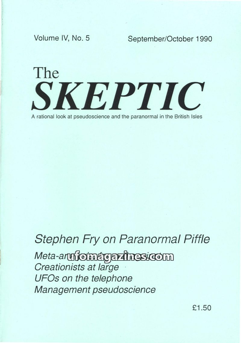 This issue of The Skeptic, published in September/October 1990, features an interview with Stephen Fry discussing his skepticism towards the paranormal and superstition. Articles a