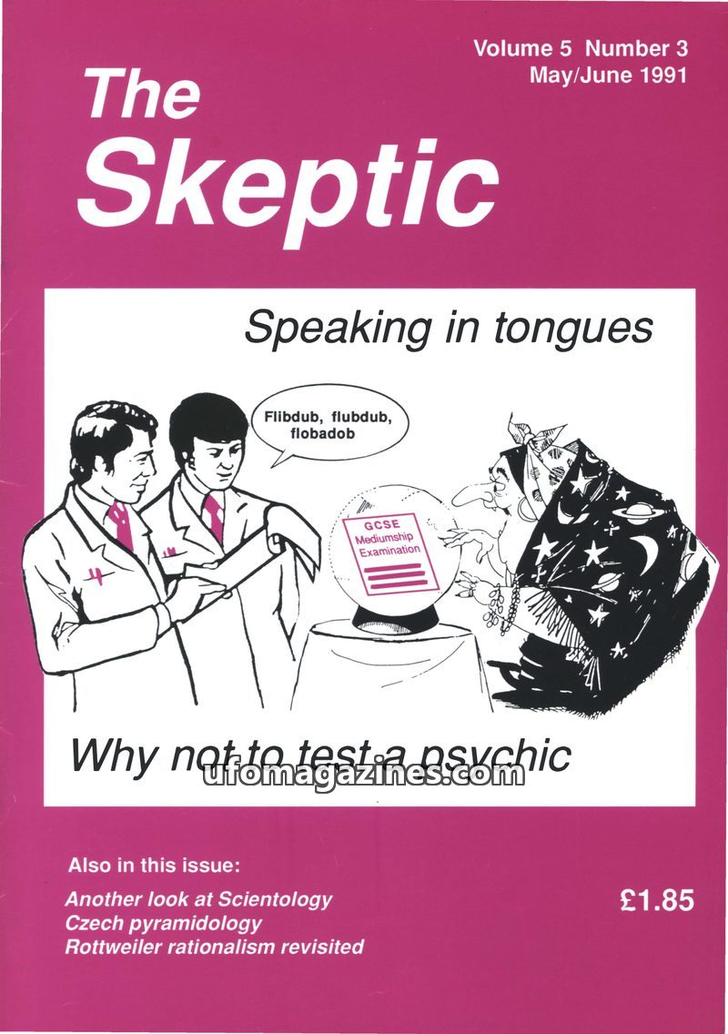 This issue of The Skeptic, dated May/June 1991, critically examines psychic claims and the media's role in promoting them. It features an article questioning the testing of psychic