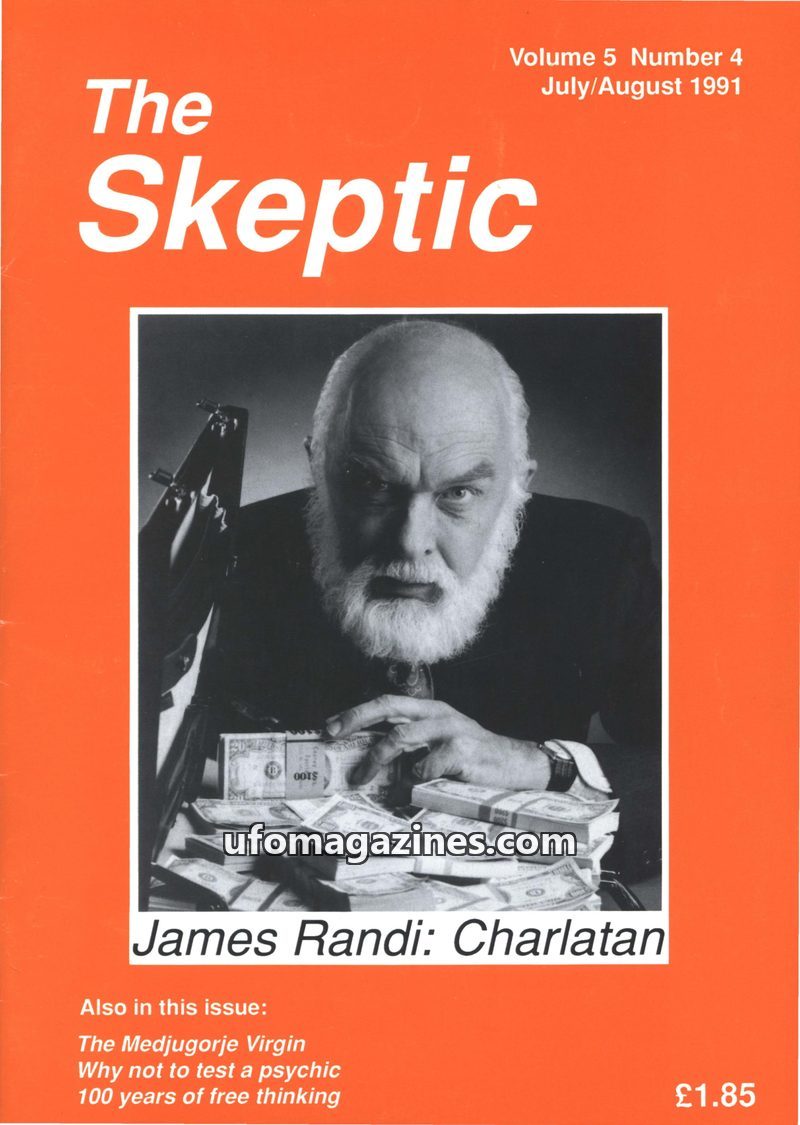 This issue of The Skeptic (Vol 5, No 4, July/August 1991) features an interview with James Randi, labeled a 'Charlatan' on the cover. Articles delve into the 'Medjugorje Virgin,' r